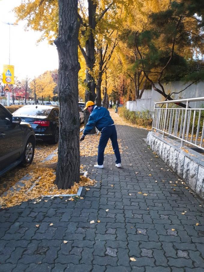 그렇게 바닥을 보며 지그재그 걷는데, 갑자기 길이 훤해진다. 홀로 열심히 빗질하는 아저씨 덕분이다. 대입 수능일인 14일에도 어김없다. 누가 알아주지도 않는데, 남들보다 먼저 일어나 길을 쓸고 있었다.
