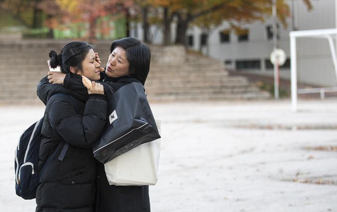 ▲ 2020학년도 대학수학능력시험일인 14일 오전 서울 중구 이화여자외국어고등학교에서 시험을 마친 수험생들이 엄마와 포옹하고 있다. [정병혁 기자]