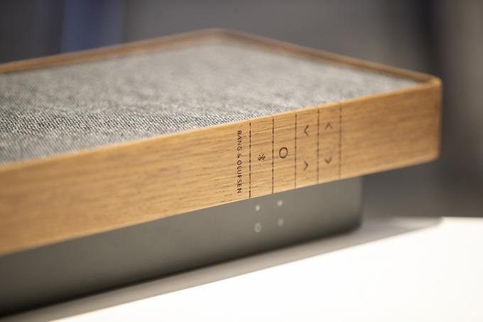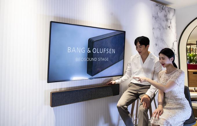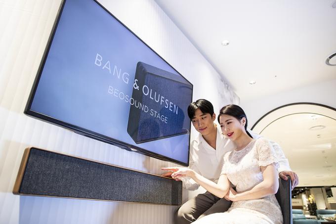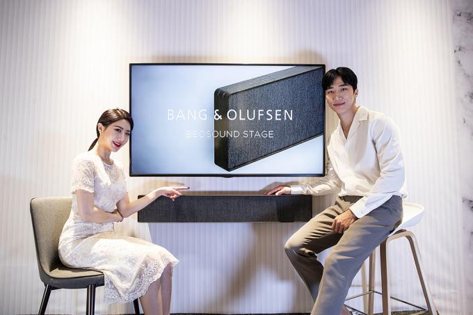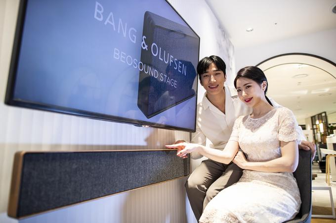 19일 오전 서울 중구 롯데백화점 뱅앤올룹슨 매장에서 모델들이 '베오사운드 스테이지'를 선보이고 있다. 뱅앤올룹슨의 첫 사운드바 '베오사운드 스테이지'는 저역의 범위까지 커버할 수 있는 4개의 커스텀 우퍼로 더 깊고 풍부한 저음을 감상할 수 있다. 가로 1108mm, 세로 178mm, 두께 77mm, 무게 8kg으로 TV와 함께 벽에 걸거나 선반에 올려두고 사용할 수 있다. 스모크오크는 290만 원, 내추럴, 브론즈톤은 190만 원.