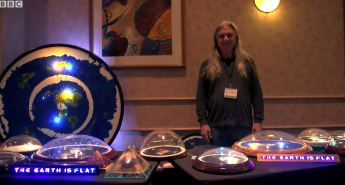 그는 트루먼쇼의 세트장 같은 돔 안에 평평한 지구와 태양, 달이 있다고 주장한다. 지구평평론자들은 지구의 가장자리는 얼음벽으로 막혀 있어 떨어지지 않으며, 지구는 움직이지 않고 인간의 달착률 사진도 조작이라고 믿는다.