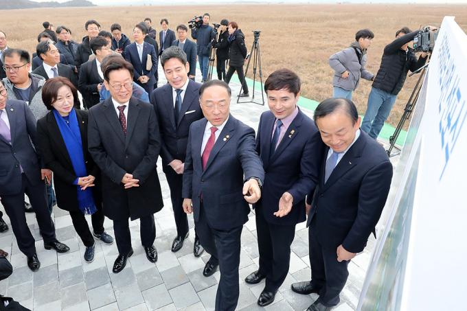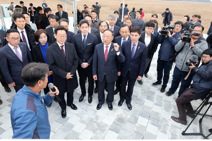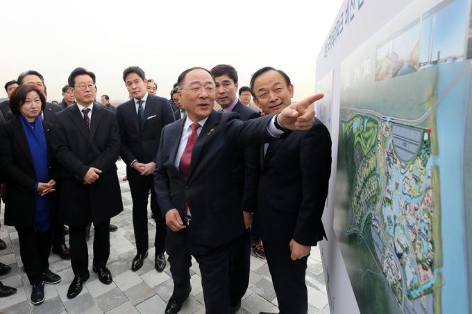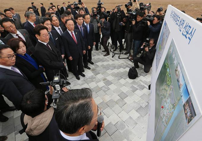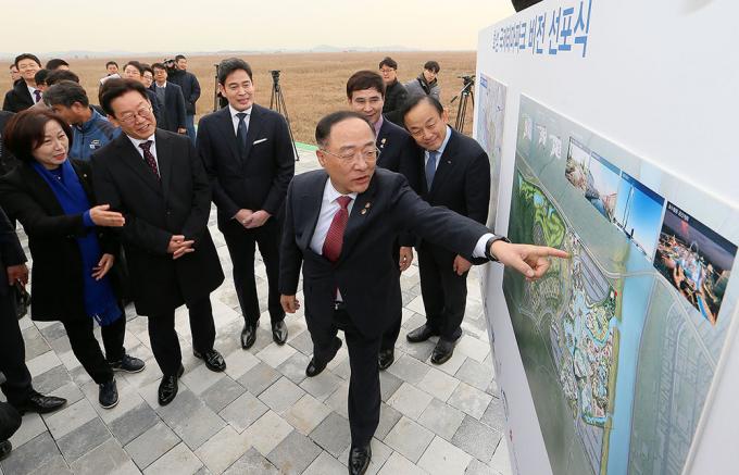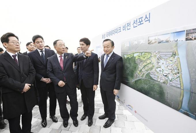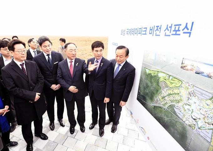 21일 오후 경기도 화성시 화성국제테마파크 부지에서 열린 화성국제테마파크 비전 선포식에서 홍남기 경제부총리 겸 기획재정부 장관, 이재명 경기도지사, 정용진 신세계그룹 부회장, 이학수 한국수자원공사 사장을 비롯한 참석자들이 테마파크 조감도를 보며 얘기를 나누고 있다.