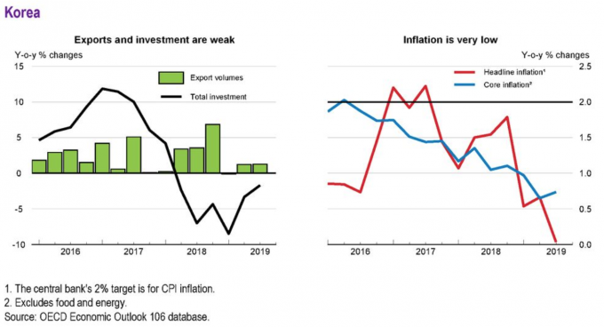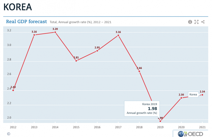 OECD는 지난해 11월 경제 전망 보고서에서 한국의 2019년 경제 성장률을 2.8%로 제시했다. 그러나 올해 5월 2.4%, 9월 2.1%로 각각 하향 조정한 데 이어 올해 11월 경제전망 보고서에서 또다시 0.1%포인트 내린 것이다.