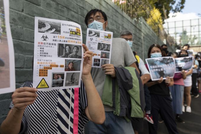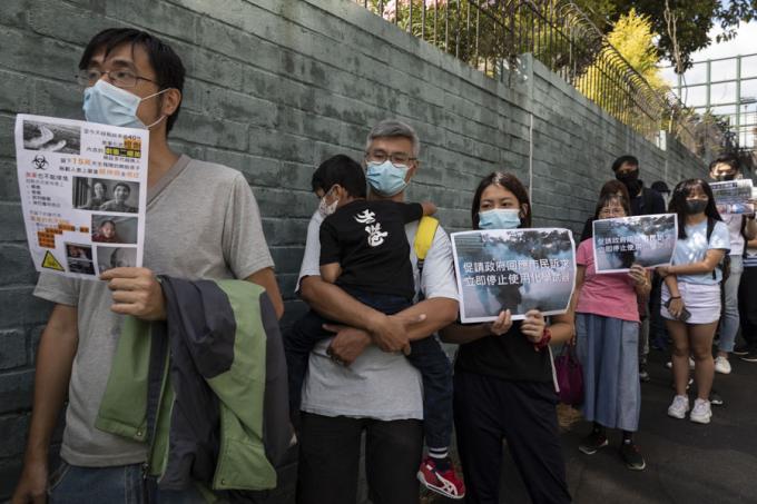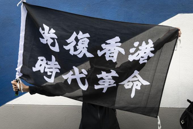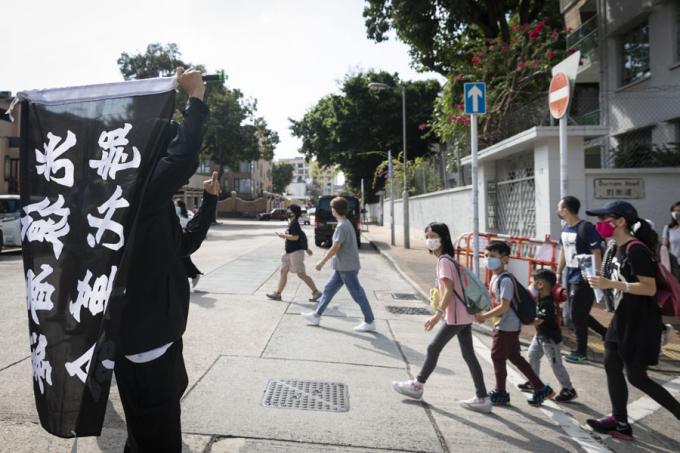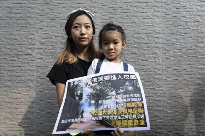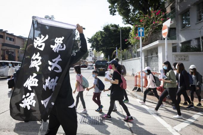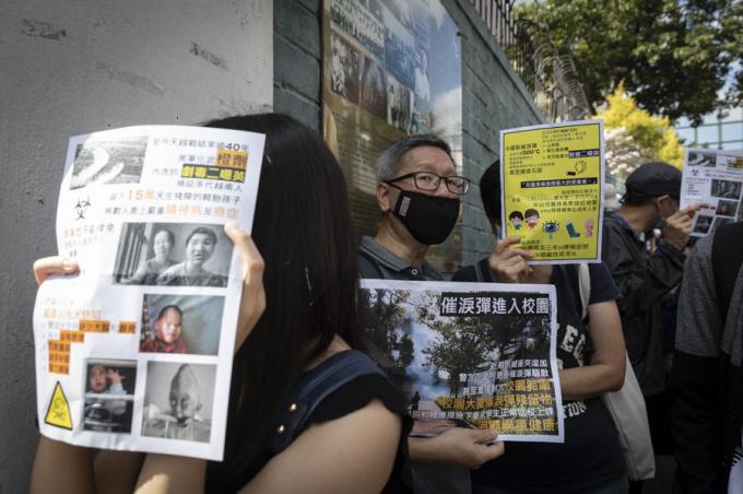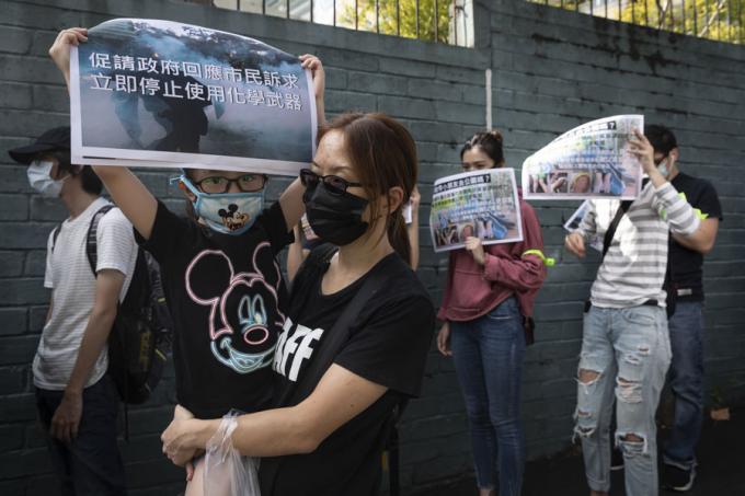 홍콩 구의원 선거를 하루 앞둔 23일 오전 홍콩 카오룽역 인근에서 시위대가 최루탄 사용 반대 행진을 하고 있다.