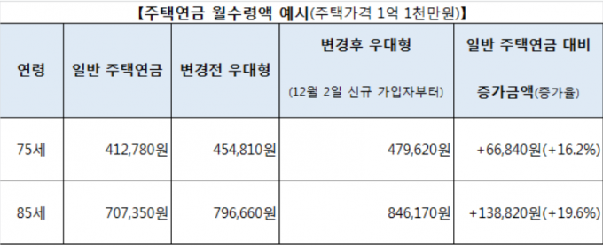 가령 1억1000만 원짜리 주택 1채를 가진 75세 어르신이 일반주택연금으로 매달 41만2780원을 받을 수 있다면, 다음 달 2일 이후 우대형 주택연금을 가입할 경우 월 수령액이 47만9620원까지 늘어난다.