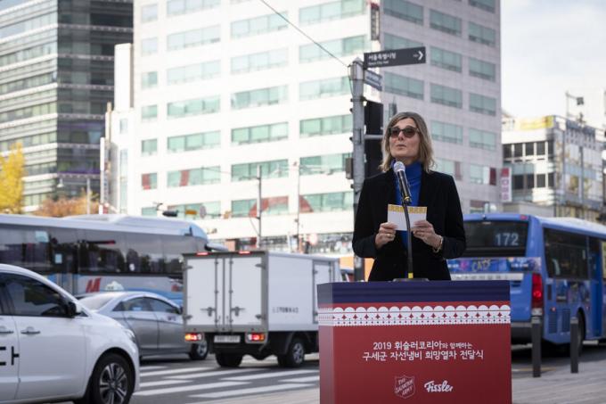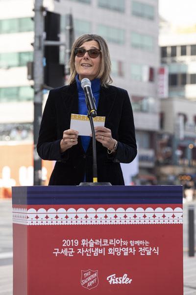 휘슬러 글로벌 세일즈 총괄이사 루시아(Jose Lucia van Hal)가 27일 오전 서울시청광장에서 열린 2019 휘슬러코리아와 함께하는 구세군 자선냄비 희망열차 전달식에 참석해 인사말을 하고 있다.