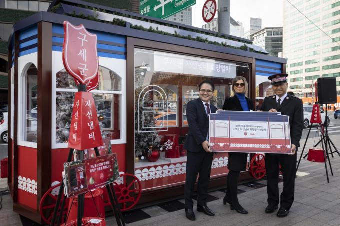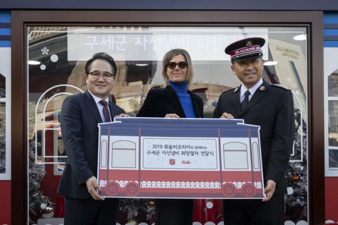 김연수 휘슬러코리아 부사장(왼쪽부터), 휘슬러 글로벌 세일즈 총괄이사 루시아(Jose Lucia van Hal), 김필수 한국 구세군 사령관이 27일 오전 서울시청광장에서 열린 2019 휘슬러코리아와 함께하는 구세군 자선냄비 희망열차 전달식에 참석해 기념촬영을 하고 있다.