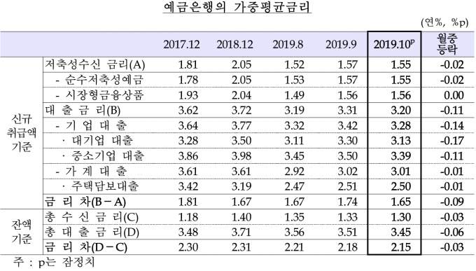 잔액 기준 예대금리차도 2.15%포인트로 3bp 줄어 2016년 10월(2.15%) 이후 3년 만에 가장 적은 차이를 기록했다.