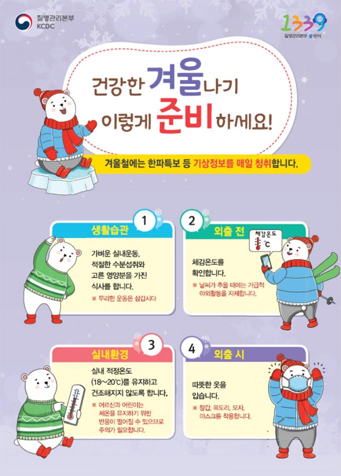질병관리본부는 "성인에 비해 체온 유지 기능이 약한 노인과 어린이는 한파 때 실외활동을 자제하고 심뇌혈관질환, 당뇨병, 고혈압 등 만성질환자도 갑작스러운 추위 노출과 무리한 신체활동은 피해야 한다"고 경고했다.