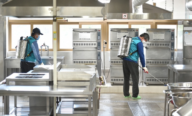 ▲ 방역관계자들이 급식실을 소독하는 모습. [뉴시스]
