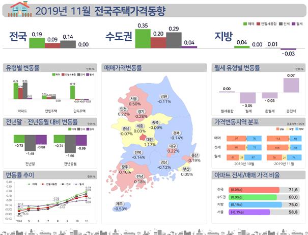 지방에서는 부산이 0.05% 올라 지난 2017년 11월 이후 2년 만에 상승세로 전환되는 등 5대 광역시가 모두 상승세를 보였다. 그 외 지방은 전남과 세종을 제외하면 하락세를 나타냈지만 지방 전체로는 지난해 11월 이후 1년 만에 상승세로 전환됐다.