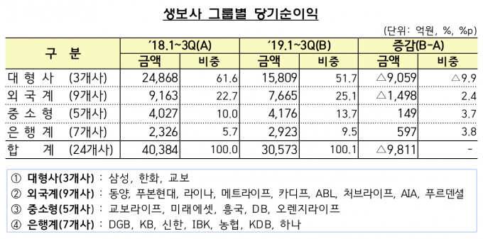 2일 금융감독원이 발표한 '2019 1~3분기 경영실적(잠정)' 자료에 따르면 생보사 당기순이익은 3573억 원으로 전년 동기(4384억 원) 대비 24.3% 급감했다.