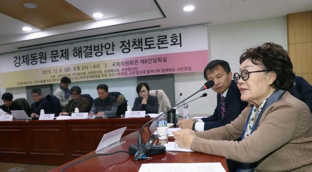 이 할머니는 이날 국회 의원회관에서 열린 '강제동원 문제 해결을 위한 정책토론회'에서 "문희상 의장을 만나보니 영어로 원플러스원'1+1+α(알파)'이라는 말을 하더라"라며 "들을 때는 몰랐는데 생각해보니 어처구니가 없고, 어처구니가 없다"고 말했다.