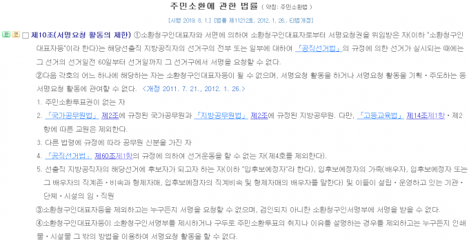 실제로 국가법령정보센터에 나와있는 '주민소환에 관한 법률' 제10조(서명요청 활동의 제한)을 보면 서명 요청에 참여할 수 있는 사람은 주민소환투표권이 있는 사람이어야 하며 공무원은 서명 요청에 참여할 수 없다. 또 인쇄물·시설물 그 밖의 방법을 이용해 서명요청 활동을 할 수 없다.