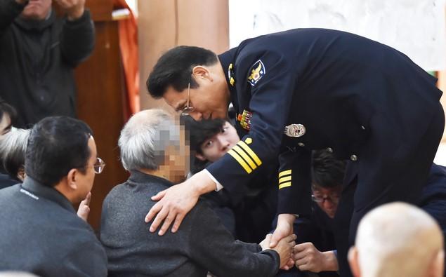 ▲배용주 경기남부지방경찰청장이 지난달 23일 오전 경기 화성시 용주사에서 열린 '화성 연쇄살인사건 희생자를 추모하는 합동위령제'에서 화성 실종 초등생 유가족을 위로하고 있다. [뉴시스]