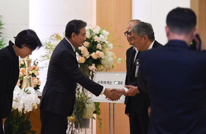 홍석현 중앙홀딩스 회장이 10일 오전 경기 수원시 아주대병원 장례식장에 마련된 고(故) 김우중 전 대우그룹 회장의 빈소를 찾아 유가족들을 위로하고 있다.