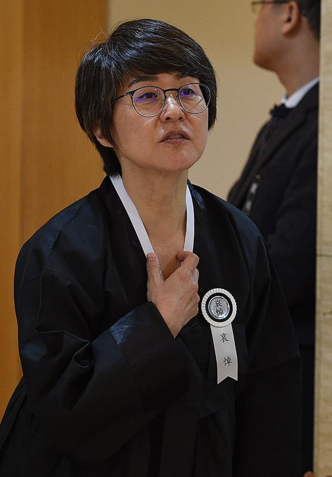 故 김우중 전 대우그룹 회장의 장녀 이선정 아트선재 관장이 10일 오전 경기 수원시 아주대병원 장례식장에 마련된 고(故) 김우중 전 대우그룹 회장의 빈소에서 조문객들을 맞고 있다.