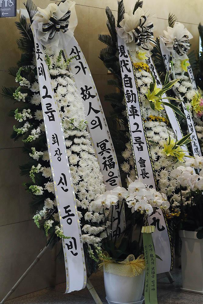 10일 경기도 수원시 아주대학교병원 장례식장에 마련된 고 김우중 전 대우그룹 회장의 빈소에 정몽구 현대자동차그룹 회장과 신동빈 롯데그룹 회장이 보낸 조화가 놓여 있다.