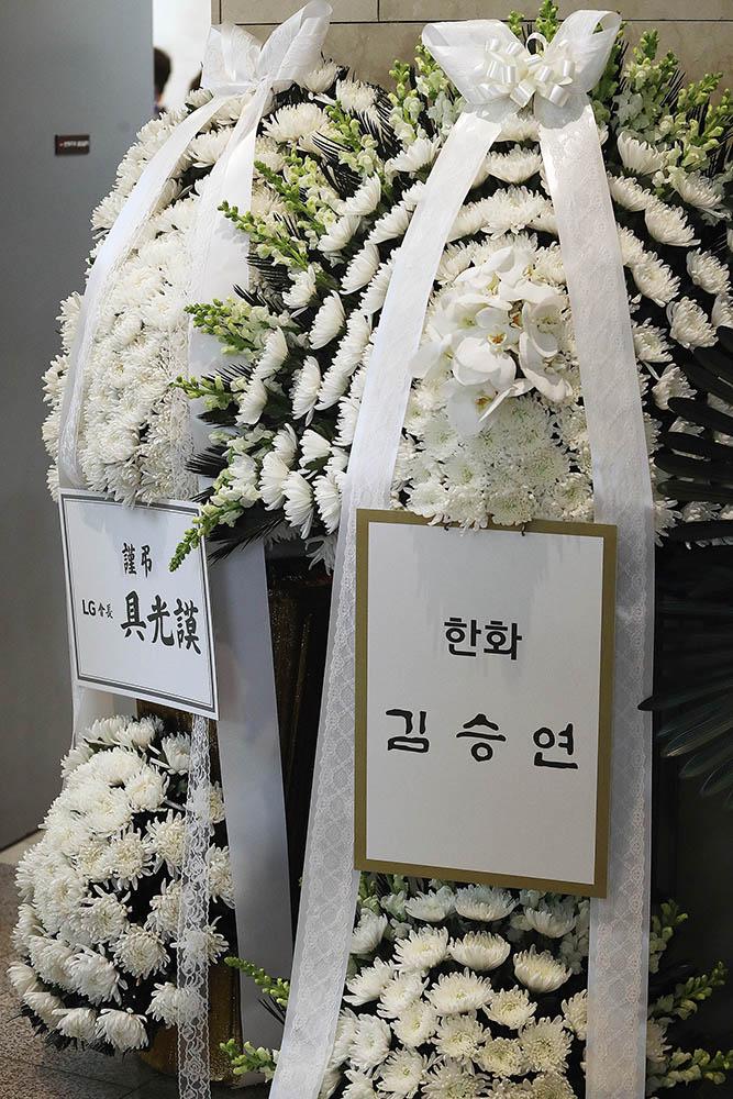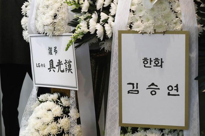 10일 경기도 수원시 아주대학교병원 장례식장에 마련된 고 김우중 전 대우그룹 회장의 빈소에 한승연 한화그룹 회장과 구광모 LG그룹 회장의 조화가 놓여 있다.