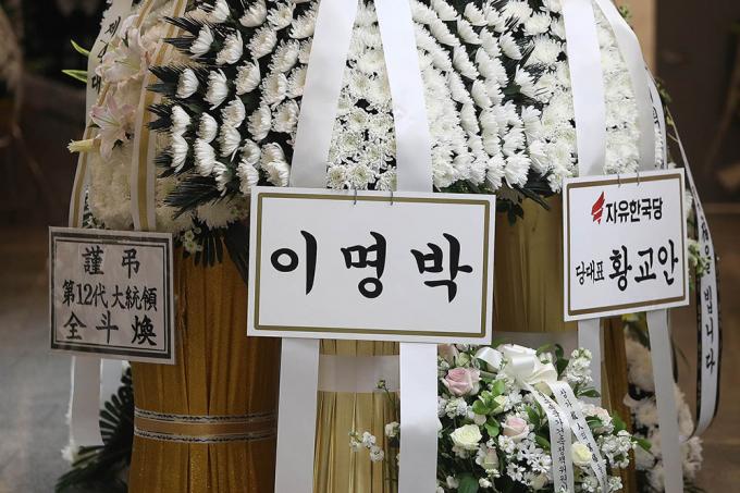 10일 경기도 수원시 아주대학교병원 장례식장에 마련된 고 김우중 전 대우그룹 회장의 빈소에 전두환, 이명박 전 대통령과 황교안 자유한국당 대표가 보낸 조화가 놓여 있다.
