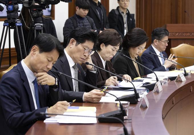 11일 오전 서울 종로구 정부서울청사에서 열린 제27차 경제활력대책회의 겸 제29차 경제관계장관회의에서 장관들이 홍남기 경제부총리의 모두발언을 듣고 있다.