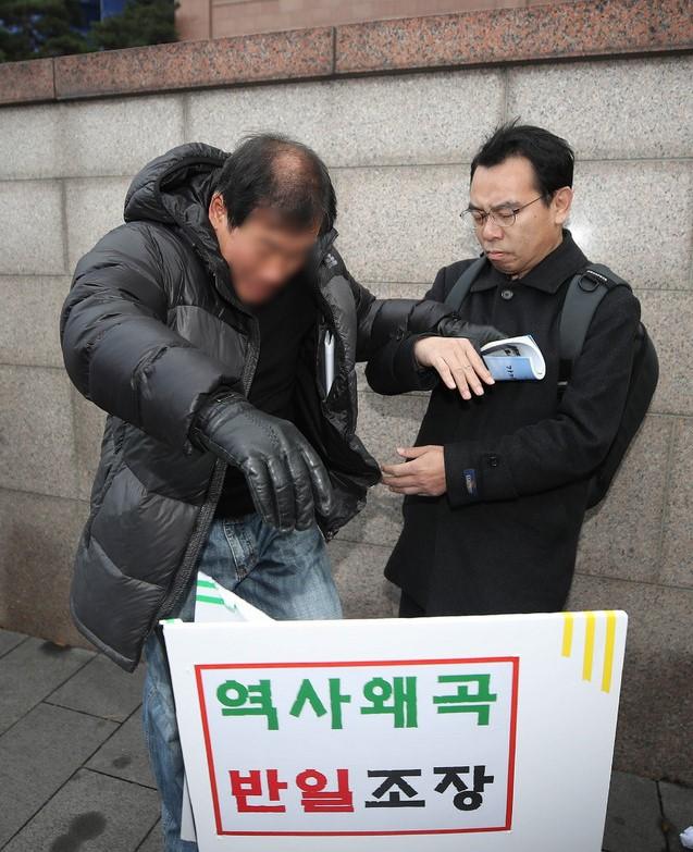 그러나 잠시 뒤 애국국민운동대연합 소속 회원으로 알려진 남성 한 명이 갑자기 이 씨가 들고 있던 피켓을 걷어차면서 재물손괴 혐의로 현행범으로 체포됐다.