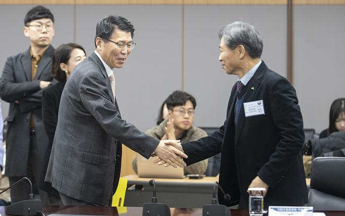 은성수 금융위원장(왼쪽)이 16일 오후 정부서울청사에서 열린 주택시장 안정화 방안 관련 금융권 간담회에서 김태영 은행연합회 회장과 인사하고 있다.