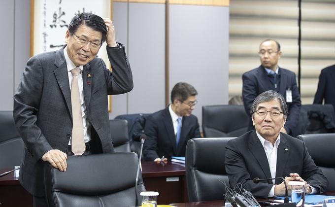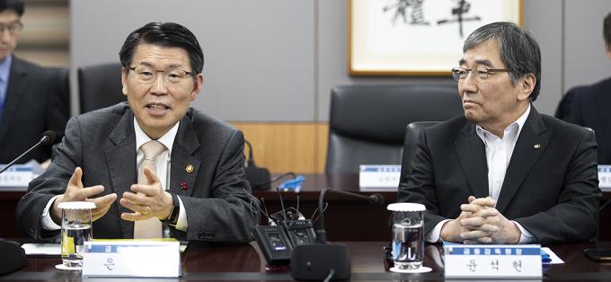 은성수 금융위원장이 16일 오후 정부서울청사에서 열린 주택시장 안정화 방안 관련 금융권 간담회에서 인사하고 있다. 오른쪽은 윤석헌 금융감독원장.