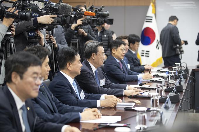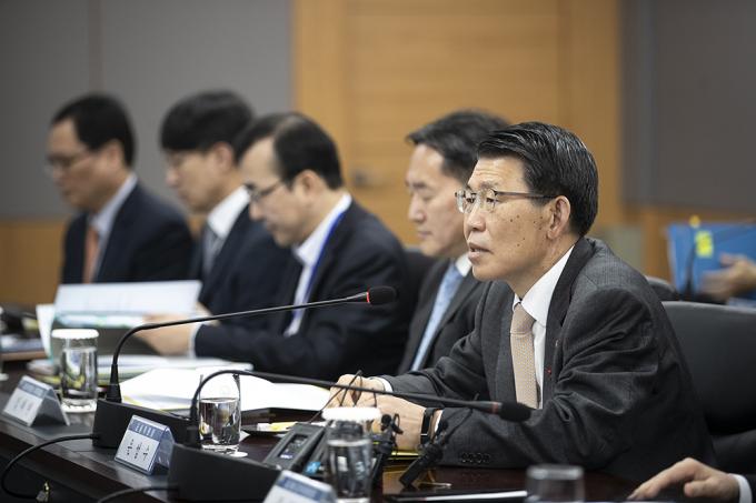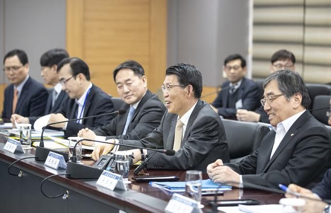16일 오후 정부서울청사에서 열린 주택시장 안정화 방안 관련 금융권 간담회에서 금융권 수장들이 은성수 금융위원장의 모두발언을 듣고 있다.