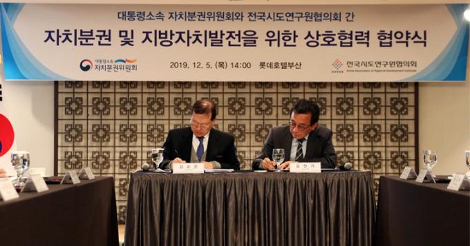 ▲대통령소속 자치분권위원회와 전국시도연구원협의회가 지난 5일 롯데호텔부산에서 자치분권 실현을 위한 상호협력 협약식을 가지고 있다. [자치분권위원회 제공]