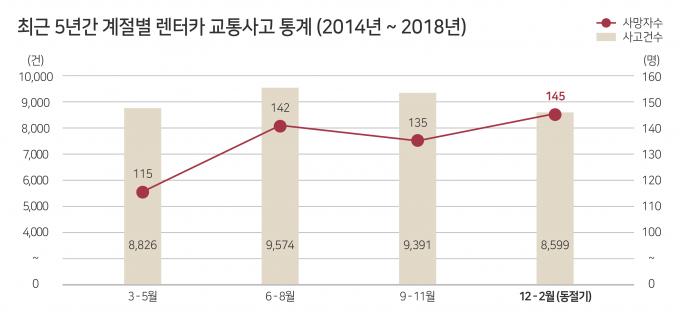 한국교통안전공단은 최근 5년간(2014∼2018년) 교통사고 현황을 분석한 결과, 동절기(12월~2월) 렌터카 교통사고 사망자 수가 모두 145명으로 전체 렌터카 사망자 수의 27%를 차지해 가장 많았다고 18일 밝혔다.