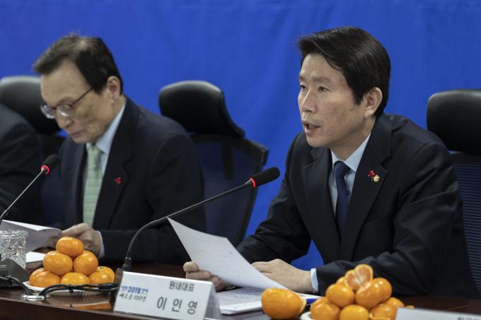 더불어민주당 이인영 원내대표(오른쪽)가 20일 오전 서울 여의도 국회 의원회관에서 열린 당 확대간부회의에 참석해 발언하고 있다.