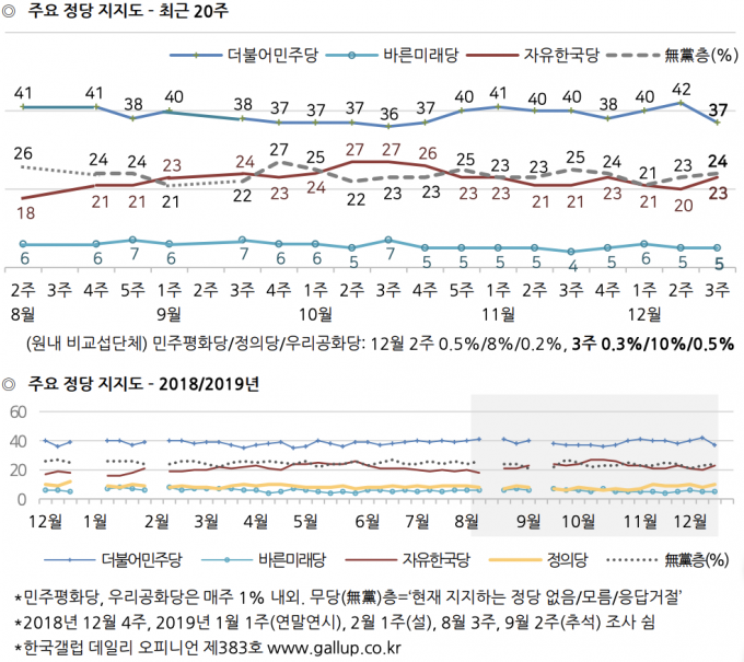 정당지지도 민주 37%, 한국 23%, 정의 10%, 무당 24%