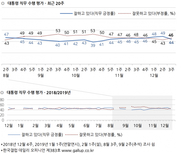 한국갤럽이 17일부터 19일까지 전국 성인 1002명을 상대로 조사해 20일 발표한 여론조사 결과, 문 대통령에 대한 긍정 평가는 44%로 전주보다 5%p 하락했다.