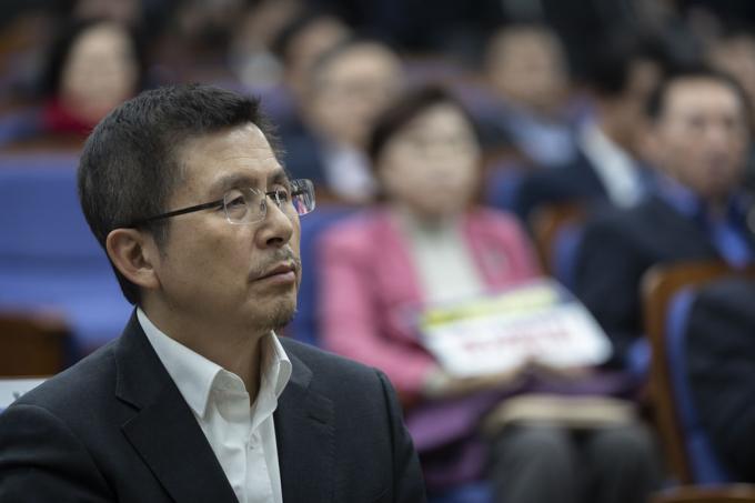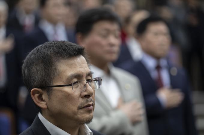 자유한국당 황교안 대표가 20일 오후 서울 여의도 국회 제4회의장에서 열린 당 의원총회에 참석해 국민의례를 하고 있다.