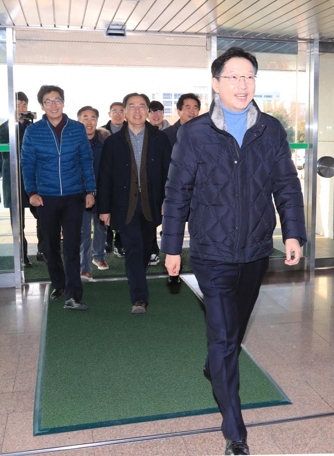 ▲김경수 경남지사가 20일 자율복장으로 간부공무원들과 함께 경남도청으로 출근하고 있다. [경남도 제공]