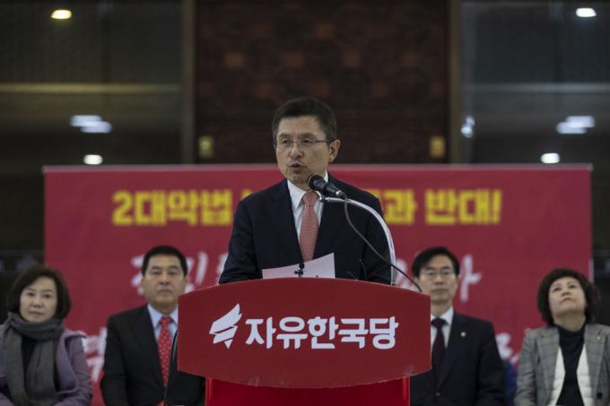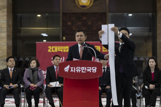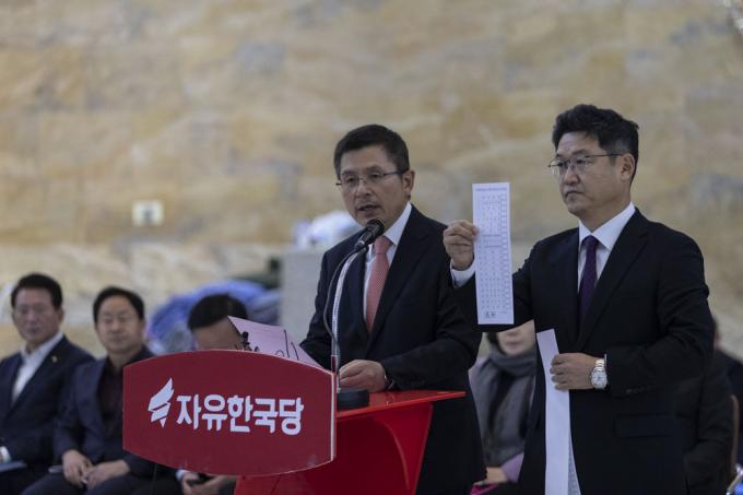 자유한국당 황교안 대표가 23일 오전 서울 여의도 국회 로텐더홀에서 열린 당 최고위원회의에 참석해 발언하고 있는 가운데 성동규 여의도 연구소장이 선거법 관련 가상의 투표용지를 보여주고 있다.