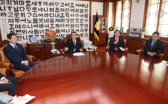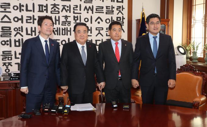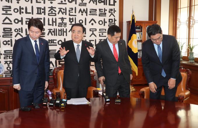 문희상 국회의장이 23일 오전 서울 여의도 국회 의장실에서 여야3당 교섭단체 원내대표와 회동을 하고 있다. 왼쪽부터 더불어민주당 이인영 원내대표, 문 의장, 자유한국당 심재철 원내대표, 바른미래당 오신환 원내대표.