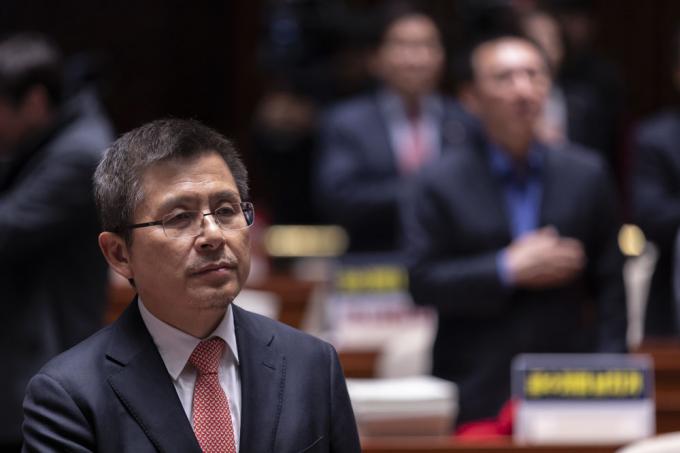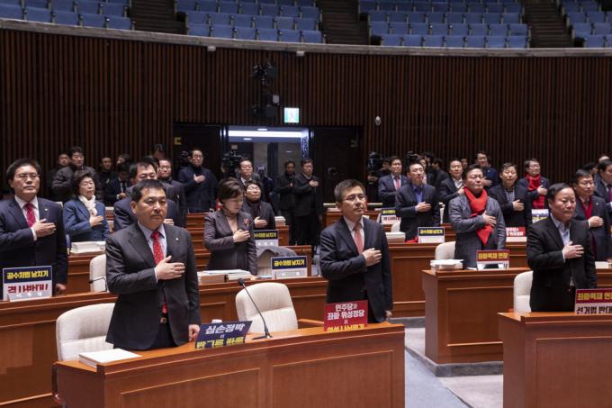 자유한국당 황교안 대표가 23일 오후 서울 여의도 국회 예결위회의장에서 열린 당 의원총회에 참석해 국민의례를 하고 있다.