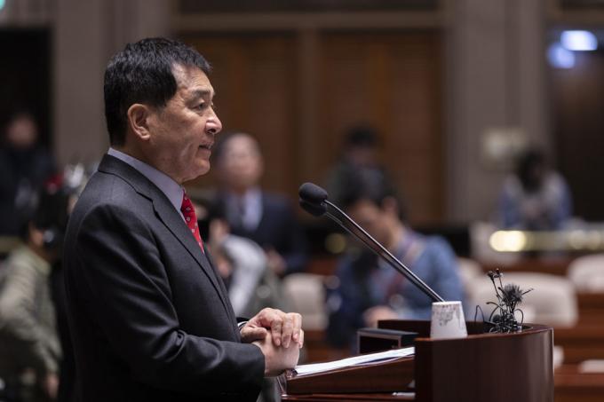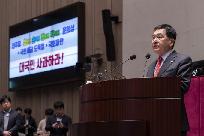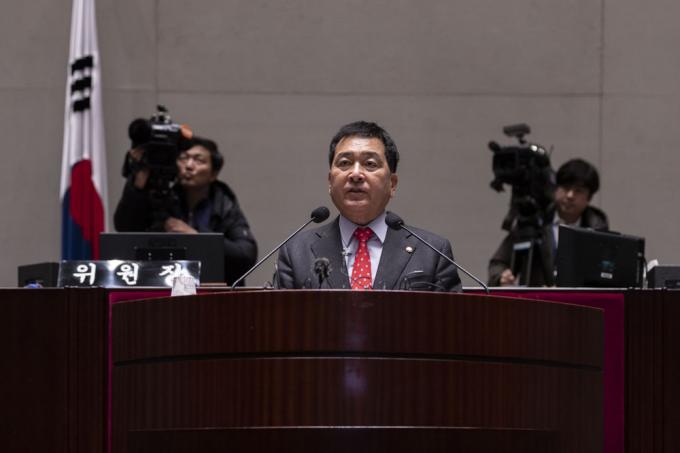 자유한국당 심재철 원내대표가 23일 오후 서울 여의도 국회 예결위회의장에서 열린 당 의원총회에 참석해 발언하고 있다.