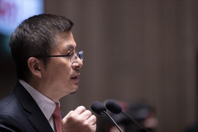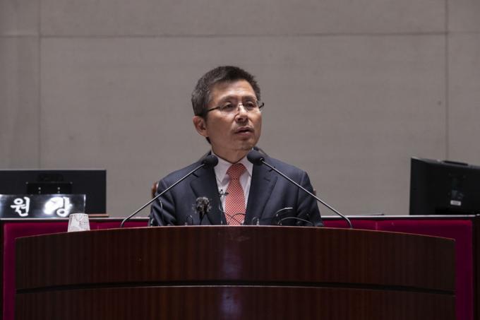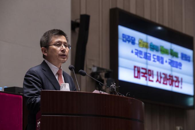 자유한국당 황교안 대표가 23일 오후 서울 여의도 국회 예결위회의장에서 열린 당 의원총회에 참석해 발언하고 있다.