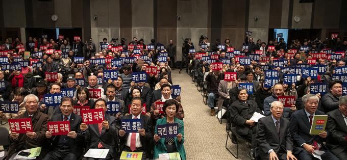▲ 23일 오전 서울 중구 프레스센터에서 열린 국민통합연대 창립대회에서 참석자들이 피켓을 들고 구호를 외치고 있다. [정병혁 기자]