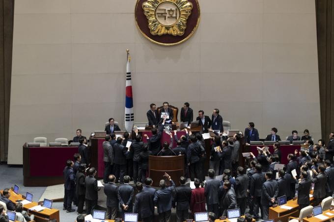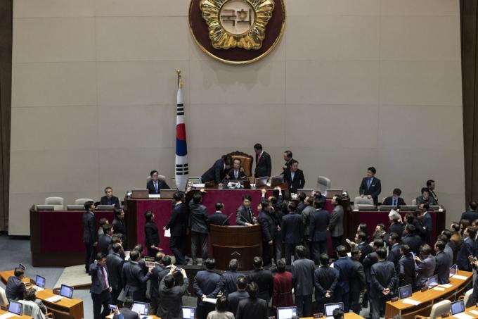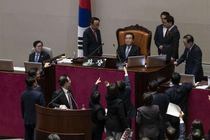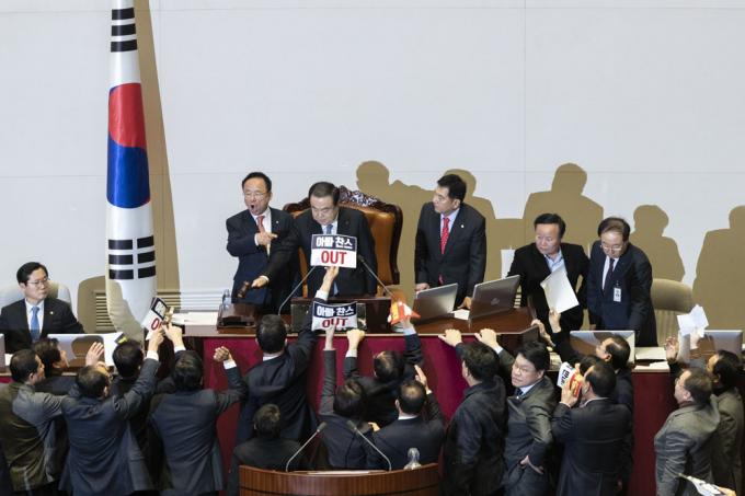 문희상 국회의장이 23일 오후 서울 여의도 국회 본회의장에서 열린 제372회 국회(임시회) 제1차 본회의에 참석해 정치개혁특별위원회 소관 공직선거법 일부개정법률안을 상정시키자 자유한국당 의원들이 강하게 항의하고 있다.