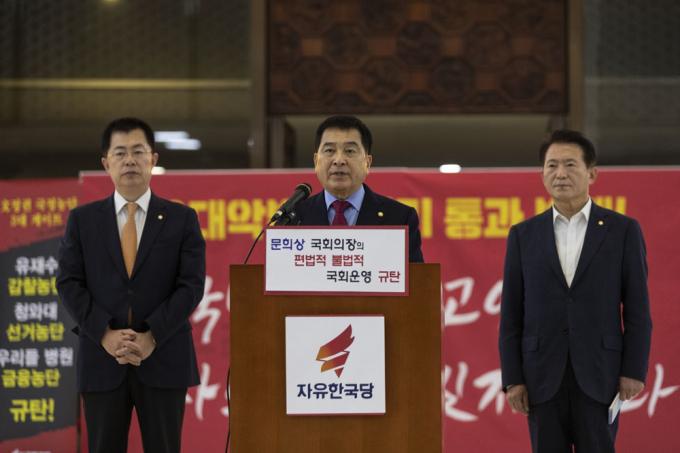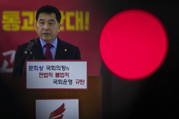 자유한국당 심재철 원내대표가 24일 오전 서울 여의도 국회 로텐더홀에서 기자회견을 하고 있다.