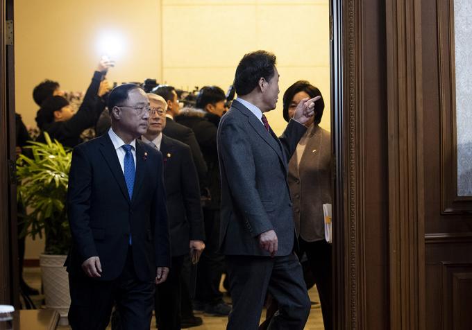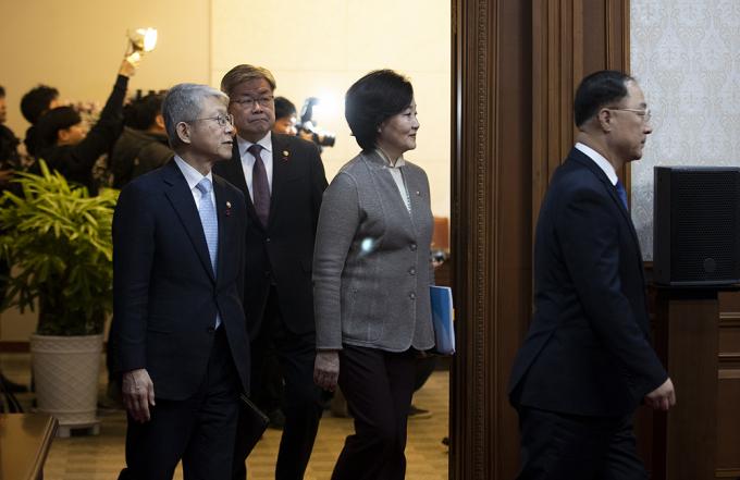 이낙연 국무총리 등 국무위원들이 24일 오전 서울 종로구 정부서울청사에서 열린 국무회의에 참석하고 있다. 이날 국무회의에서는 지난 10일 국회를 통과한 2020년도 예산안 512조2505억원을 처리할 예정이다.