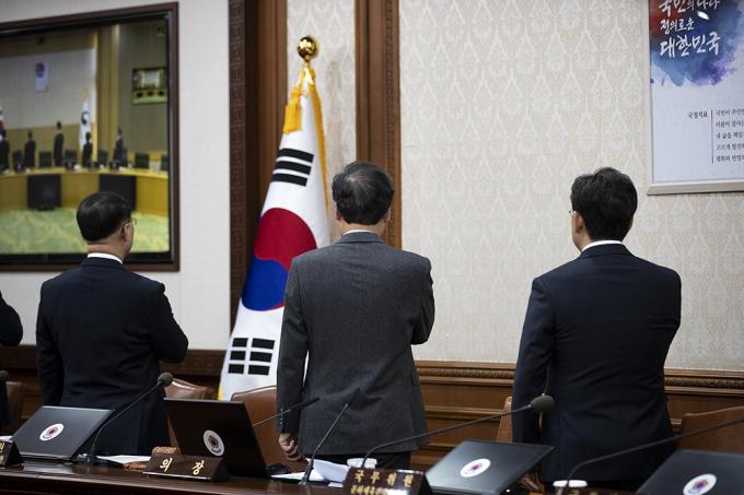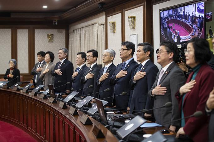 이낙연 국무총리 등 국무위원들이 24일 오전 서울 종로구 정부서울청사에서 열린 국무회의에서 국민의례를 하고 있다. 이날 국무회의에서는 지난 10일 국회를 통과한 2020년도 예산안 512조2505억원을 처리할 예정이다.