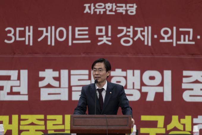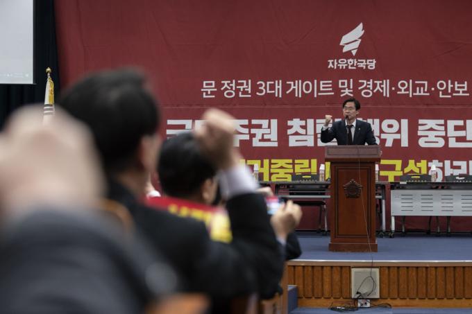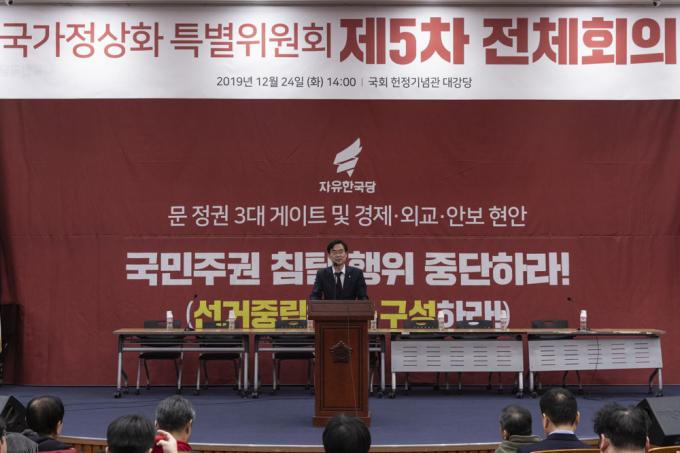 자유한국당 조경태 의원이 24일 오후 서울 여의도 국회 헌정기념관에서 열린 '국가정상화특별위원회 제5차 전체회의'에 참석해 구호를 외치고 있다.