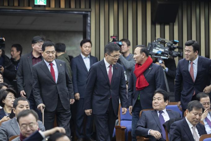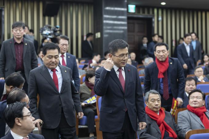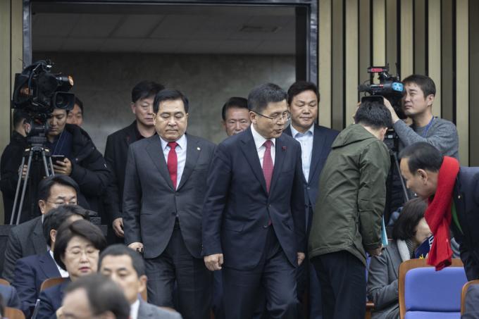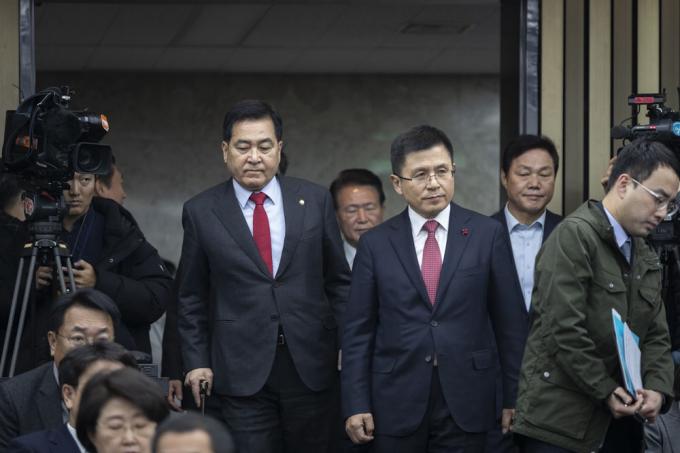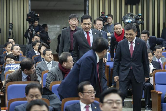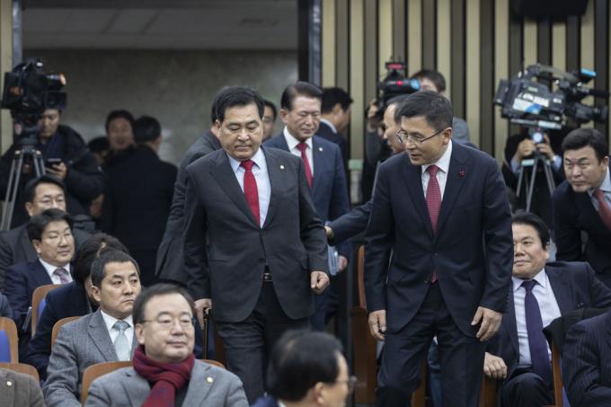 자유한국당 황교안 대표와 심재철 원내대표가 30일 오후 서울 여의도 국회 제4회의장에서 열린 당 의원총회장에 들어오고 있다.