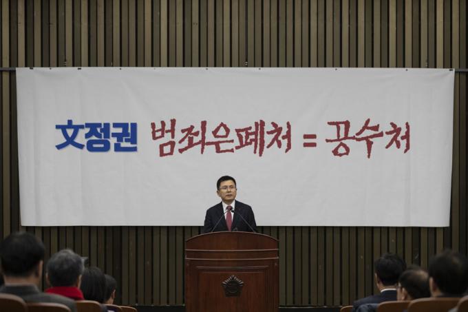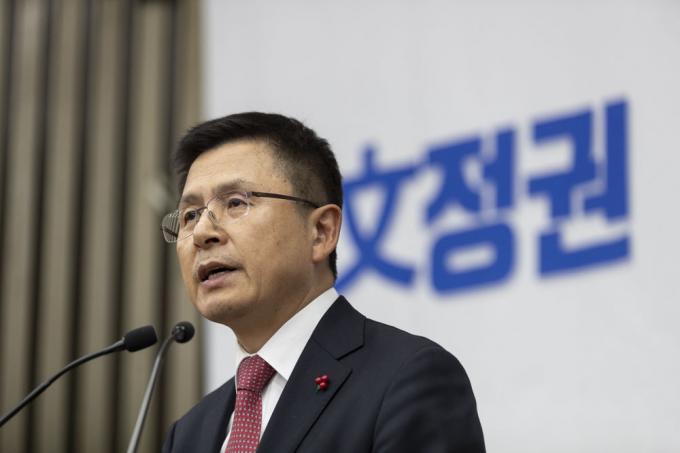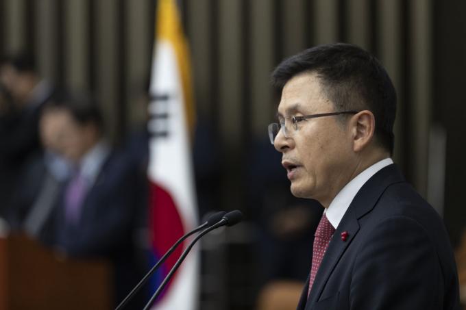 자유한국당 황교안 대표가 30일 오후 서울 여의도 국회 제4회의장에서 열린 의원총회에 참석해 발언하고 있다.