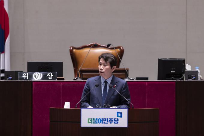 더불어민주당 이인영 원내대표가 30일 오후 서울 여의도 국회 예결위회의장에서 열린 당 의원총회에 참석해 발언하고 있다.
