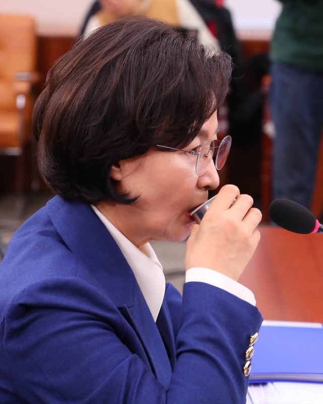 추미애 법무부장관 후보자가 30일 서울 여의도 국회 법제사법위원회에서 열린 법무부장관 후보자 인사청문회에 출석해 물을 마시고 있다.